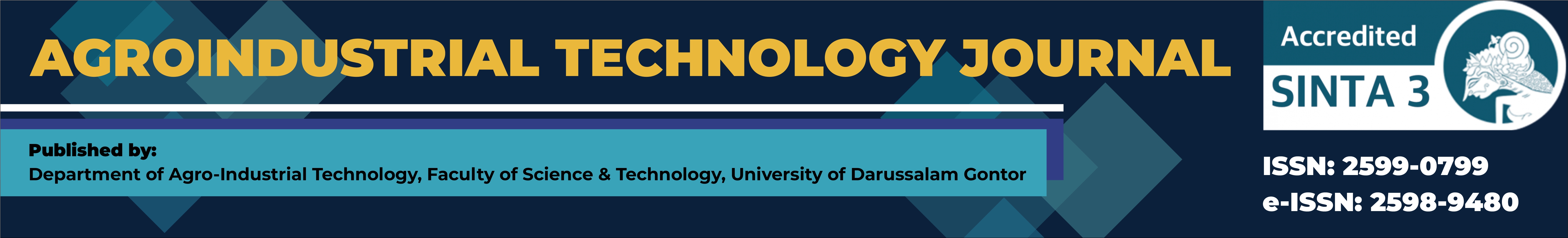 | Agroindustrial Technology Journal (ATJ) with registration number ISSN 2599-0799 (print) and ISSN 2598-9480 (online), This journal was managed by the Department of Agroindustrial Technology, Universitas Darussalam Gontor. Furthermore, based on the Decree of the General Director of Strengthening the Research, Technology and Higher Education of the Republic of Indonesia No. 225/E/KPT/2022, it was designated as an Accredited Scientific Journal (Sinta 3) from Vol. 6 No. 1, 2022 to Vol. 10 No. 2, 2026. Since 2019, Open Journal Systems (OJS) has been applied for all business processes in ATJ. Therefore, authors are required to register in advance and upload their manuscripts online. This system allows readers, authors, editorial boards, editors, and peer reviewers to obtain the real-time status of manuscripts. | ||
